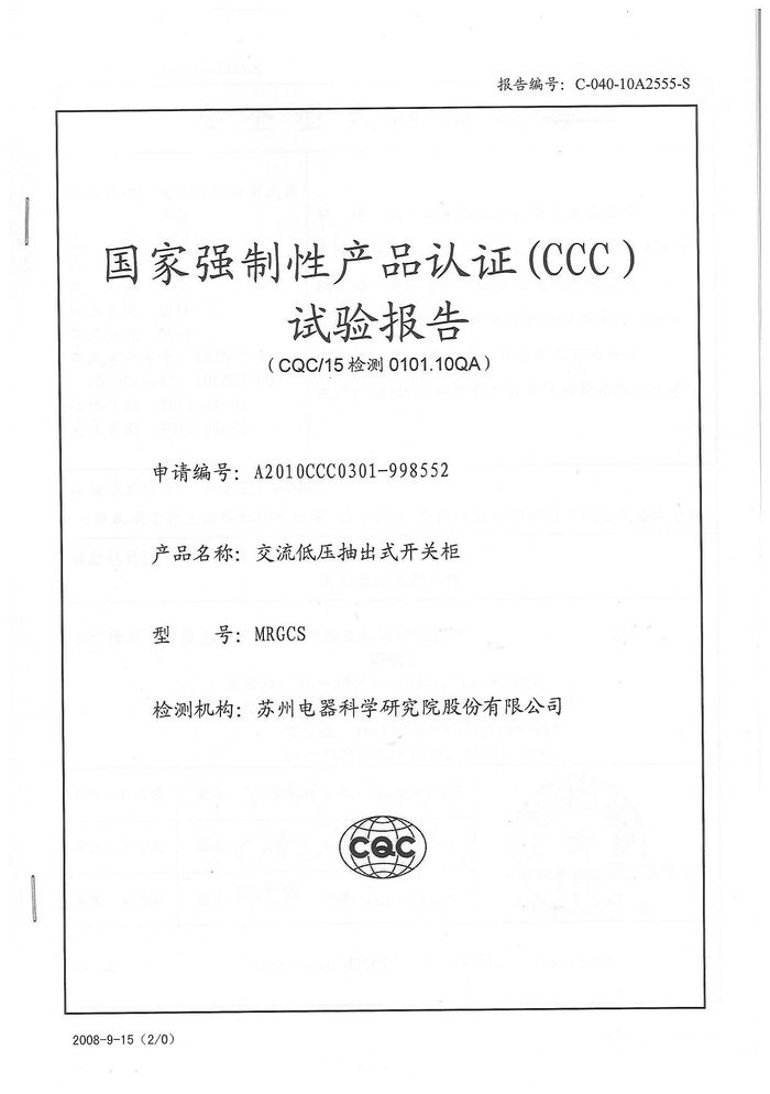 (成套)MRGCS開(kāi)關(guān)柜資質(zhì)證書