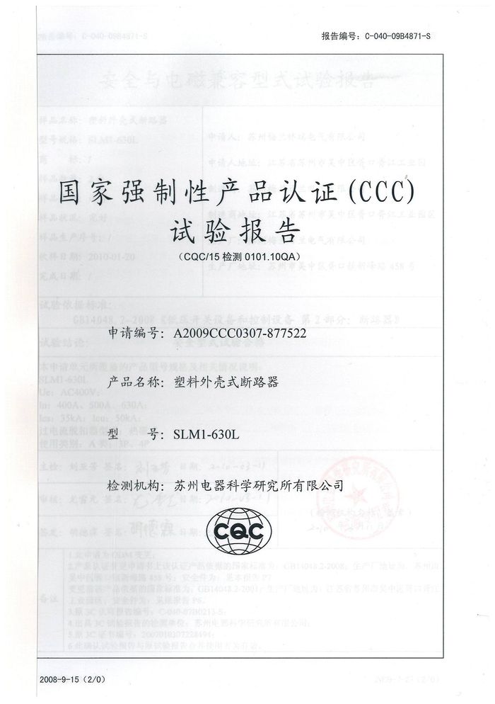 SLM1-630L塑殼斷路器資質(zhì)證書