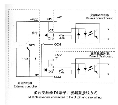 注意:此種接線方式,下同變頻器的Dl端子不能并接使用,否則可能引起Dl的誤動(dòng)作;若需Dl端子并接(不同變頻器之間),則需在Dl端子處串接二吸管(陽(yáng)極接Dl)使用,二極管需滿足;IF>lOmA、UF<1V,如下圖。